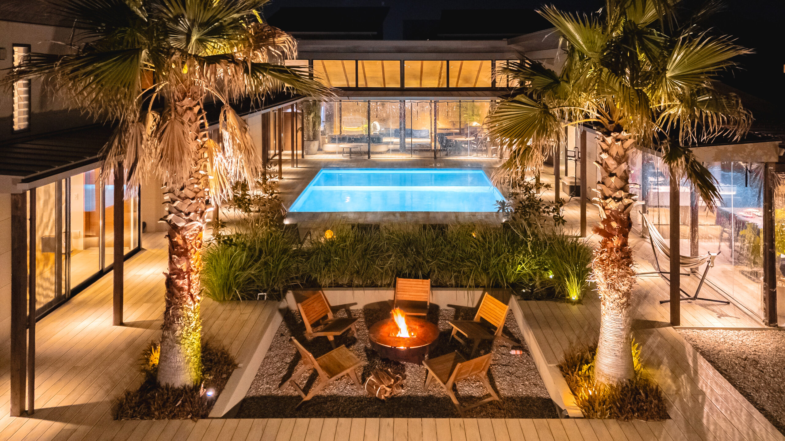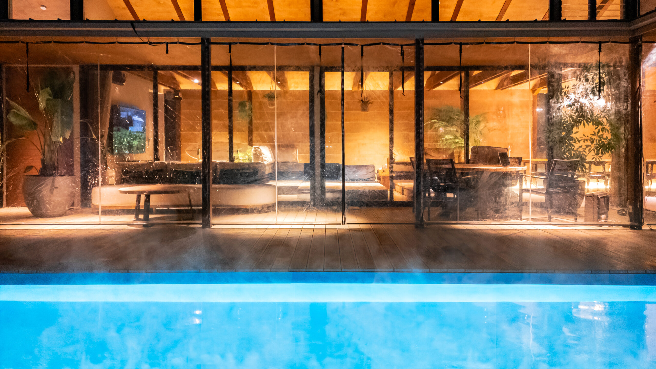 約40℃まで調節が可能な温水プール、焚き火を楽しむファイヤープレイス