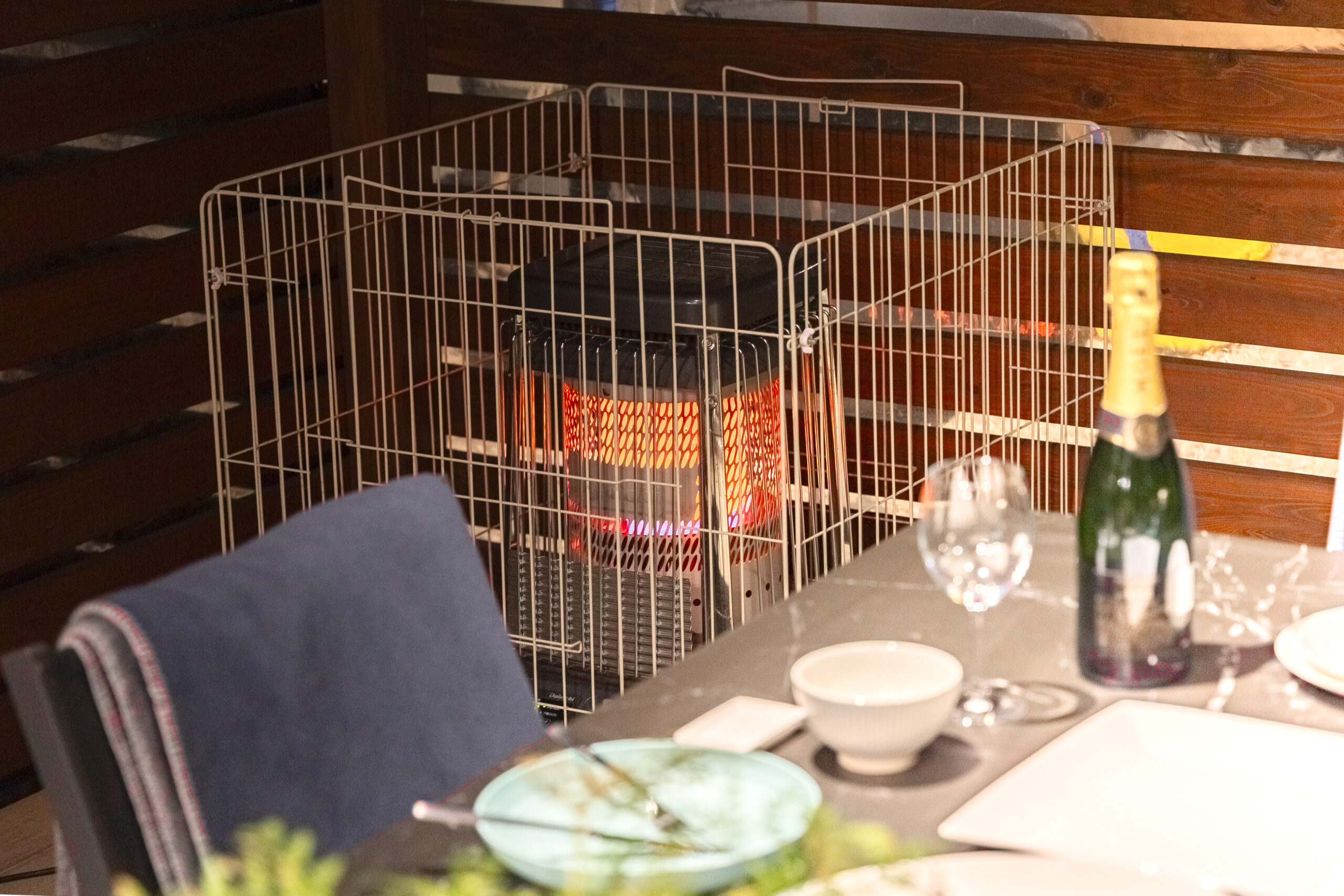 ビニールウォールに囲まれた暖房設備の整ったバーベキューエリア